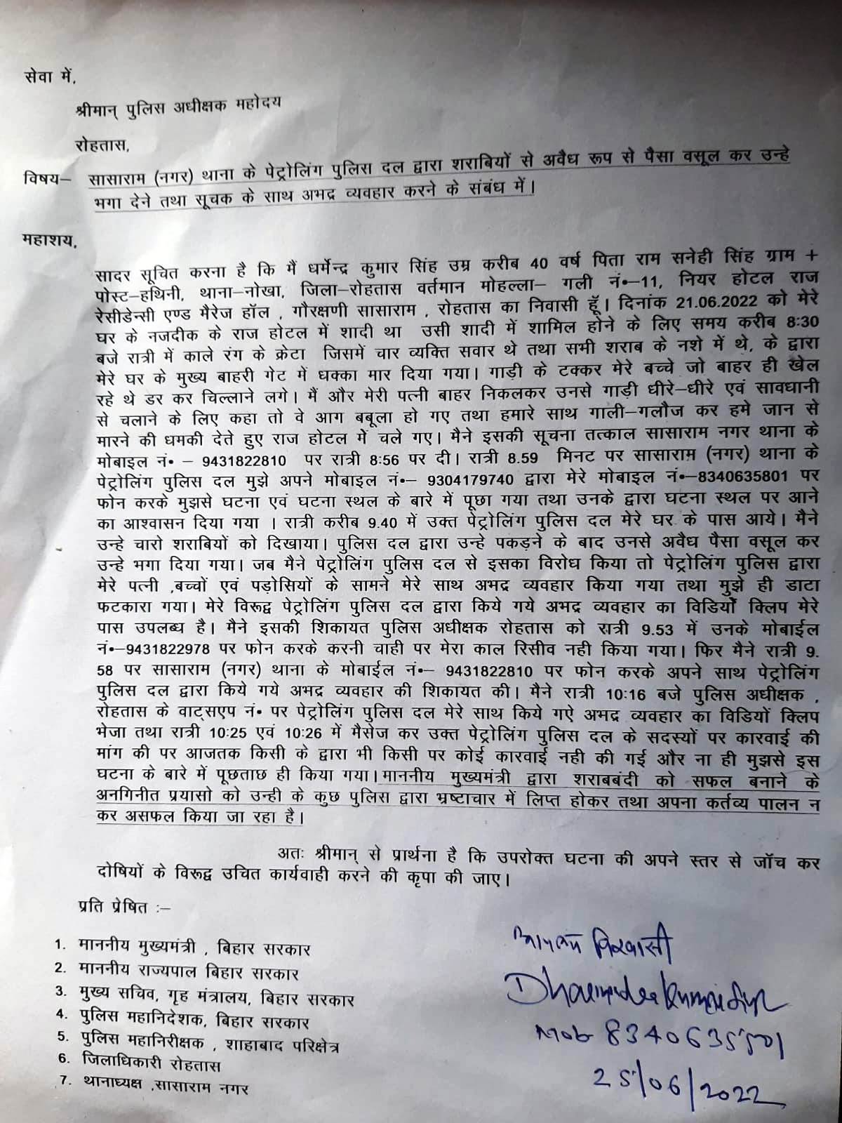 बकौल धर्मेन्द्र उन्हों ने इसकी शिकायत एसपी रोहतास से भी करनी चाही लेकिन फोन रिसीव नही किया गया। बाद में बनाया गया वीडियो क्लिप उन्हों ने एसपी के व्हाट्सएप पर भेज दिया, लेकिन अब तक कोई कार्रवाई नही हो सकी है। फिलहाल यह मामला पत्र के माध्यम से बिहार के राज्यपाल, मुख्यमंत्री, मुख्य सचिव, डीजीपी, के अलावें डीआईजी शाहाबाद और डीएम रोहतास समेत एसपी तक भेजा जा चुका है। पत्र में घटना का जिक्र करते हुए यह अनुरोध किया गया है कि मामले की जांच कर उचित कार्रवाई की जाए।