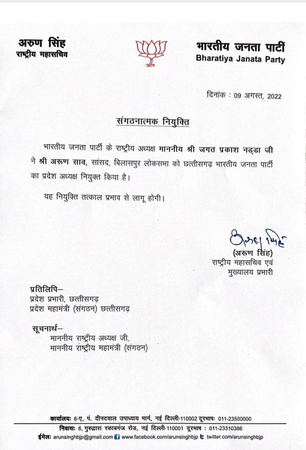 पार्टी ने एक बयान में कहा, “भाजपा प्रमुख जेपी नड्डा ने बिलासपुर के सांसद अरुण साव को तत्काल प्रभाव से छत्तीसगढ़ पार्टी का अध्यक्ष नियुक्त किया है।”