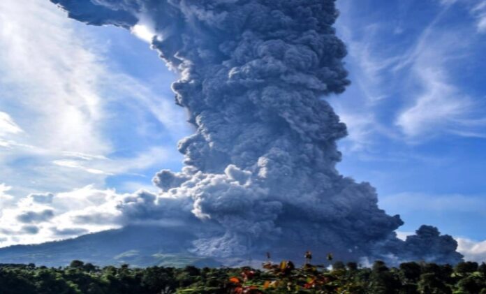 सुमात्राः इंडोनेशिया के सुमात्रा द्वीप में सोमवार सुबह माउंट सिनबंग में ज्वालामुखी विस्फोट हो गया। इस दौरान हवा में 5 किलोमीटर तक राख नजर आई। सरकार के मुताबिक, इस दौरान कोई जनहानि नहीं हुई है।