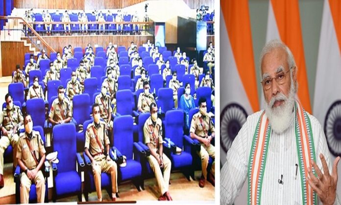 नई दिल्लीः प्रधानमंत्री नरेन्द्र मोदी ने आज सरदार वल्लभभाई पटेल राष्ट्रीय पुलिस अकादमी में ‘दीक्षांत परेड कार्यक्रम’ के दौरान IPS प्रशिक्षुओं  के साथ वीडियो-कॉन्फ्रेंस के माध्यम से बातचीत की। इस अवसर पर पीएम मोदी ने कहा कि वह अकादमी से पास आउट हो चुके युवा IPS अधिकारियों के साथ नियमित रूप से बातचीत करते हैं लेकिन इस साल कोरोना वायरस के कारण वह उनसे मिलने में असमर्थ रहे। उन्होंने कहा कि मुझे यकीन है कि अपने इस कार्यकाल के दौरान मैं निश्चित रूप से आप सभी से कहीं मिलूंगा।