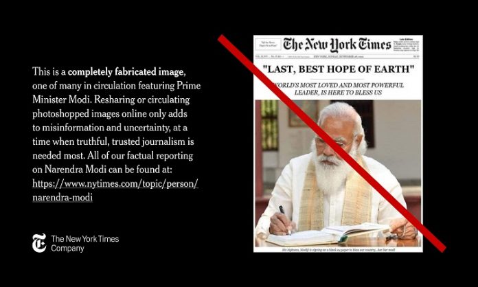 वायरल तस्वीर की सच्चाई बताते हुए न्यूयॉर्क टाइम्स ने बुधवार को कहा कि पहले पन्ने पर भारतीय प्रधानमंत्री नरेंद्र मोदी को “पृथ्वी की अंतिम, सर्वश्रेष्ठ आशा” शीर्षक वाले लेख की तस्वीर “पूरी तरह से मनगढ़ंत” है। नकली तस्वीर भारत में सोशल मीडिया पर खूब शेयर की जा रही है।