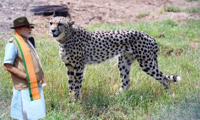 नई दिल्लीः प्रधानमंत्री नरेन्द्र मोदी ने शनिवार को भारत से विलुप्त हो चुके जंगली चीतों को कुनो नेशनल पार्क में छोड़ा। इन चीतों के नामीबिया से लाया गया है। इन चीतों को ‘प्रोजेक्ट चीता’, जोकि मांसाहारी बड़े जंगली जानवरों के अंतर-महाद्वीपीय स्थानांतरण की दुनिया की पहली परियोजना है, के तहत भारत में पेश किया जा रहा है। इन आठ चीतों में से पांच मादा और तीन नर हैं।