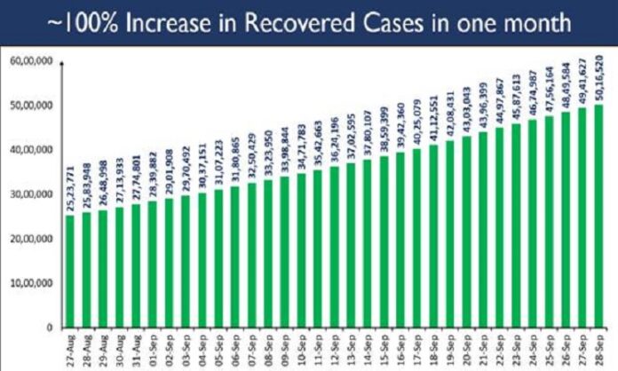 नई दिल्लीः भारत में कोविड के ठीक हुए मामलों की संख्या ने आज 50 लाख के कीर्तिमान को भी पीछे छोड़ दिया। सेमवार को स्वास्थ्य एवं परिवार कल्याण मंत्रालय की ओर जारी सूचना के मुताबिक यह संख्या 50,16,520 है। रोजाना कोविड के मरीजों के बड़ी संख्याज में ठीक होने से भारत की दैनिक रिकवरी का रुख लगातार उच्चव स्तकर पर बना हुआ है। देश में पिछले चौबीस घंटों के दौरान 74,893 रोगी ठीक हुए हैं।
